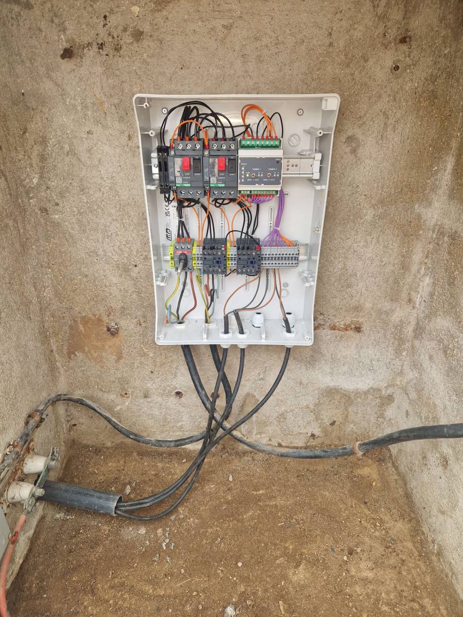 Nous avons procédé à l’installation d’un coffret de commande moderne, équipé de composants électriques interchangeables, ce qui permet une maintenance simplifiée et une intervention rapide en cas de défaillance. Ce nouvel équipement assure désormais un fonctionnement fiable et sécurisé de la station de relevage, tout en étant conforme aux exigences réglementaires actuelles.
